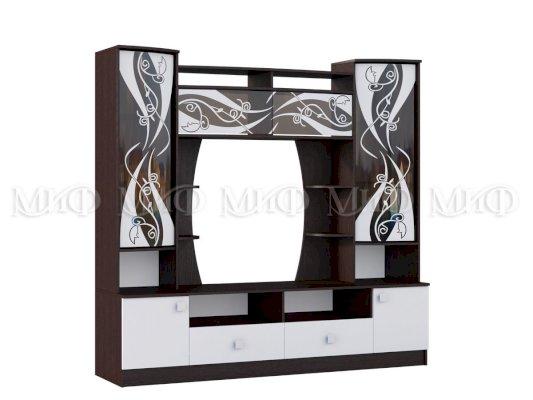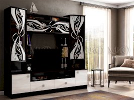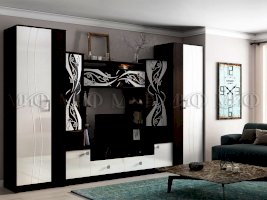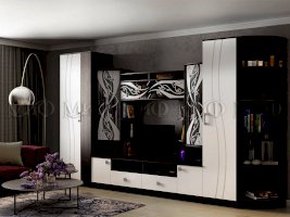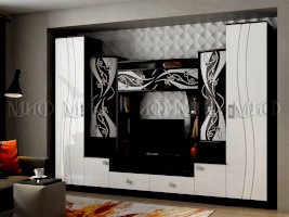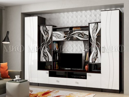 Белая гостиная из МДФ. Яркое решение для гостиной комнаты. Стеклянные дверцы верхних фасадов за счет их декорирования матовым рисунком, выглядят стильно и практично. Гостиные со стеклом - хорошая возможность создать уникальный интерьер.
