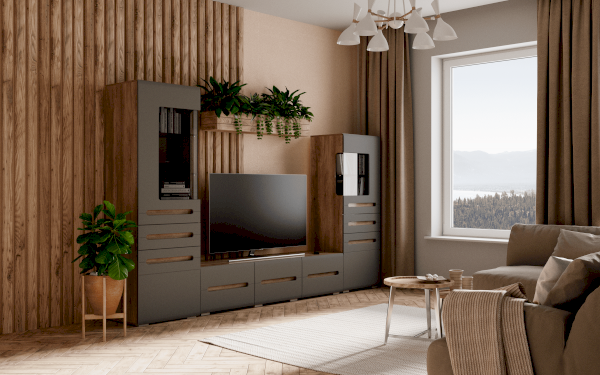 Стильная и очень вместительная тумба под ТВ Наоми является частью одноимённой модульной серии. Модель выполнена из качественной ЛДСП, а фасады отделаны МДФ. На столешнице тумбы поместится телевизор любого размера, а в секциях с распашными створками можно хранить необходимую технику или аксессуары для нее.