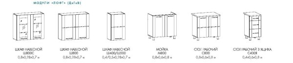 Глубина верхних шкафов указана без учета фасада, высота столов указана без учета столешницы