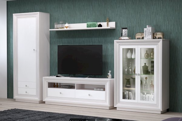 Яркий образ респектабельной мебели в стиле Ар-деко нашел свое отражение в рельефном багете МДФ в пленке ПВХ с мягким сатиновым эффектом «жемчуг», фасадах в таком же исполнении и изысканной лицевой фурнитуре в виде ручек с растительным рисунком цвета «венецианское серебро». Корпус изделия выполнен из ЛДСП, при этом основные детали выполнены из плиты толщиной 25 мм и оформлены кромкой ПВХ 4 мм.