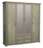 Данная модель – настоящая мини-гардеробная и отличная альтернатива целой комнате, ведь в нем поместится вся ваша одежда – и не только! Все в нем учтено до мелочей. Распашные двери – две глухие по краям и две зеркальные в центре – удобны и практичны. Внутреннее пространство продумано и зонировано. По краям, справа и слева расположились полки, на которых можно разместить одежду, а также коробки-боксы с вещами или обувью. В каждом отсеке находится по 5 полок, что оптимально по высоте: четыре полки в свободной зоне доступа даже для человека с маленьким ростом, а пятая, верхняя – для тех, кто повыше. Так что, если вы обладаете высоким ростом, у вас есть явные преимущества – это будет только ваше пространство! Каждая полка выдерживает до 5 кг – это достаточно для большого количества вещей. Глухие двери скроют от посторонних глаз то, что для них не предназначено. Центральные дверцы шкафа – зеркальные, это избавляет владельцев шкафа приобретать отдельное зеркало. Наверху расположена удобная горизонтальная полка, которая служит в качестве антресоли, куда можно убрать сезонные вещи, либо предметы, которыми хозяева пользуются не так часто. Центральный отсек снабжен металлической штангой, которая выдерживает вес до 20 кг, и предназначен для одежды на вешалках. Можно надеть любимое платье или костюм, закрыть шкаф и тут же оценить себя в зеркале. Очень удобно! Два выдвижных ящика под центральным отсеком подойдут как для вещей, так и для обуви – это зависит от помещения, где расположен шкаф. Если он находится в спальне, то в ящиках можно разместить белье – один отсек для НЕЕ, другой – для НЕГО, а если в холле или в прихожей, то в ящиках поместится обувь всей семьи. Благодаря современным технологиям дверцам и выдвижным ящикам не нужны доводчики – они легко и дружелюбно распахиваются и выдвигаются навстречу  по первому желанию хозяев. Шариковые направляющие обеспечивают очень плавный ход. Дверцы и ящики снабжены металлическими ручками, которые учитывают анатомию ладони, поэтому ими очень удобно пользоваться.